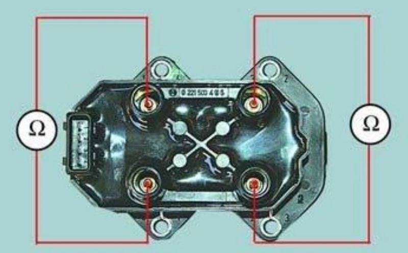 4. С помощью мультиметра проверьте сопротивление вторичных обмоток катушки между контактами 1 и 4, 2 и 3. Сопротивление при +20 должно быть примерно 11.5-13.5 кОм.