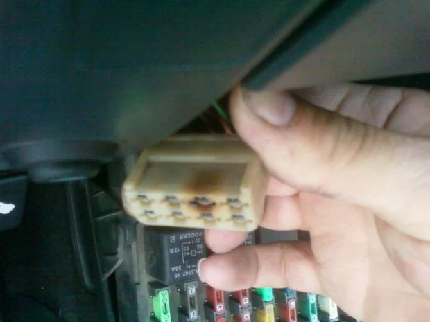 Это разъём не на блоке, над блоком, с левой стороны спрятан. Там ответная часть в таком-же состоянии. И есть ещё одинарный разъём, красный провод пожалуй, тоже подгорает и отгорает. Смотрите внимательно.