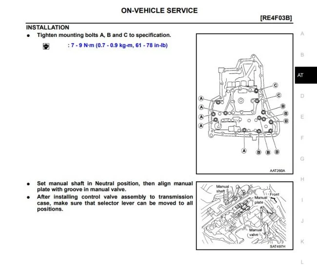 Здравствуйте. Момент затяжки болтов гидроблока 7 — 9 N·m (0.7 — 0.9 kg-m, 61 — 78 in-lb), это для акпп RE4F03B.