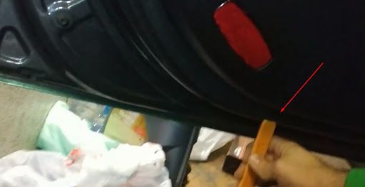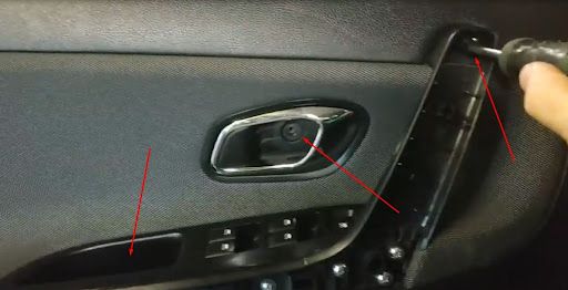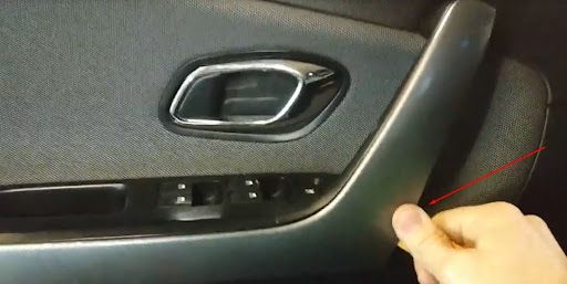 В ниже отмеченных местах снимите пластиковые заглушки и открутите три винта крепления накладки двери. Винты под крестовую отвертку. Заглушки удобно вынимать с помощью пластиковых лопаток для разборки салона.