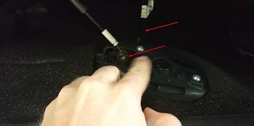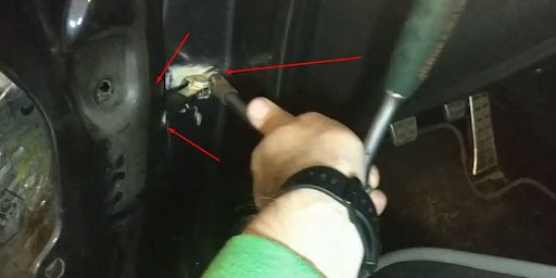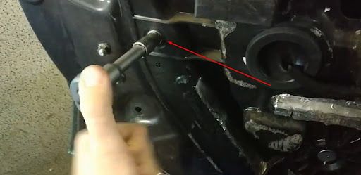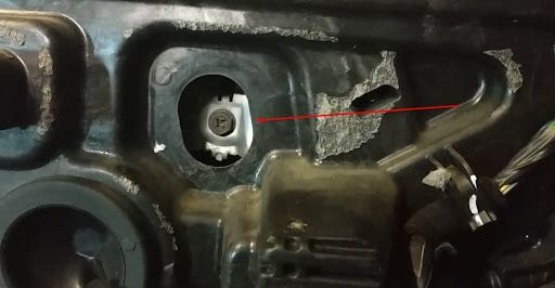 После снятия обшивки подсоедините разъем на кнопки стеклоподъемников и опустите стекло до момента, пока в отверстиях появятся болты крепления стекла. Отверстия закрыты резиновыми заглушками. Всего нужно выкрутить два болта. Ниже на фото отмечен один из болтов. Для откручивания болта нужна головка на десять и вороток с удлинителем.