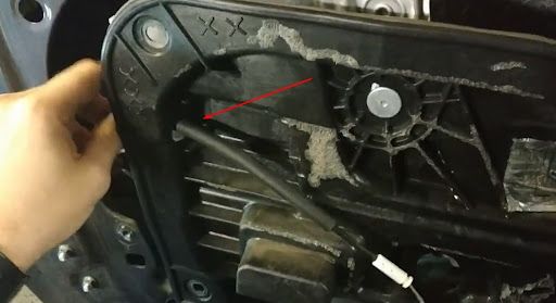 Для снятия механизма стеклоподъемника открутите примерно десять болтов крепления под головку на десять и выведите трос открывания двери через отверстие. Далее отсоедините все разъемы и уберите механизм в сторону.