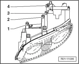 Проверить равномерность работы обеих фар при регулировке установки фар. Если дальний свет(по конструкции) регулируется отдельно от ближнего света, то в приборе для регулировки фар -VAS 5047- значение наклона для дальнего света должно быть установлено на „0“.