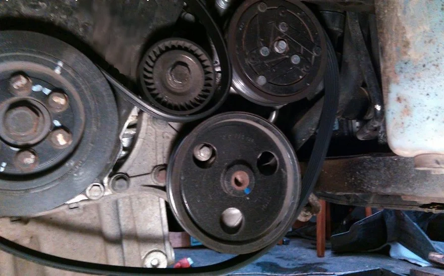 Удерживая натяжитель, снимаем ослабший приводной ремень. Одеваем новый ремень и прикручиваем все в обратном порядке.