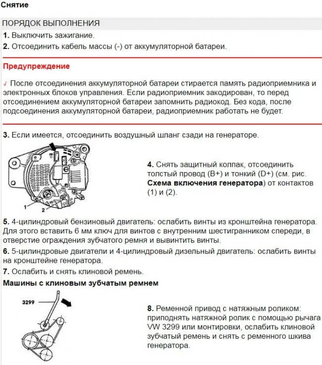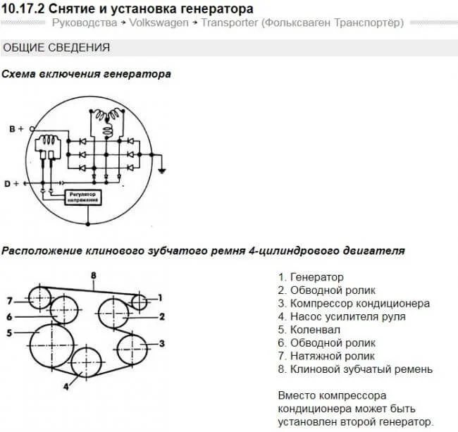 Вот здесь при снятии генератора, и написано как снять ремень, одевание — в обратном порядке Снятие и установка генератора «Volkswagen Transporter».