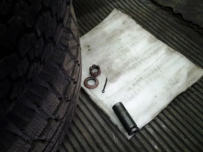 Либо там надо вытащить шплинт, который не даёт самопроизвольно открутиться гайке, а потом открутить гайку (лучше головкой). Срывать надо, пока колесо не снято с автомобиля и стоит на асфальте. Резьба правая, откручивать влево (с любой стороны автомобиля).