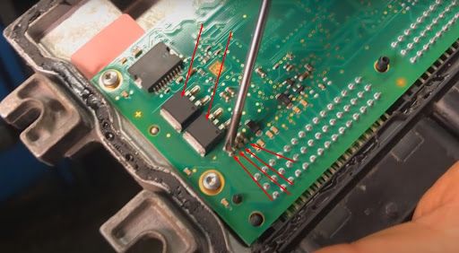 Суть поломки состоит в том, что в блоке управления двигателем перегорают ниже отмеченные управляющие транзисторы и резисторы.