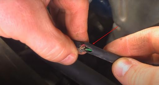 В большинстве случаев перегорание транзисторов вызывает КЗ в проводе на датчик давления фреона. Сам провод конструктивно проложен вокруг генератора и при ДТП провода перебиваются внутри изоляции. Ниже на фото отмечено, в каком состоянии может быть провод после снятия изоляции.