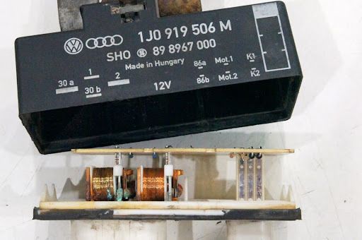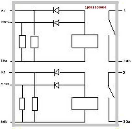 Нужно подать 12 вольт на контакты 86а и 86b (второе реле) и по очереди на корпус K1 и K2 (второе реле). Если реле не срабатывают, то блок управления вентилятора нужно менять. Приобрести его можно по артикулу 1J0919506M.