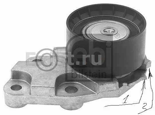 Нужно что бы на заведенном моторе стрелочка 1 совпадала со стрелочкой 2, натяжение регулируется проворачиванием помпы — она эксцентрична.