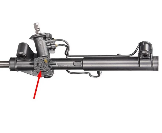 Рейка подтягивается как с ГУР так и ЭГУР так и с ЭУР. На фото отметил гайку (из трубы можно сделать спец ключ), за ней должна стоять пружина и башмак который прижимает вал рулевой рейки с вертикальным валом, со временем покрытие башмака стирается и пружина ослабевает. Можно немного подтянуть, градусов 20 примерно, немного и проверить на стук, так то по правильному гайку подтягивают и проверяют усилие вращения на стенде.