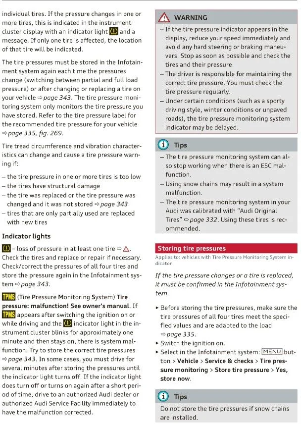 Select in the Infotainment system: MENU > Vehicle > Service & checks > Tire pressure monitoring > Store tire pressure > Yes, store now.