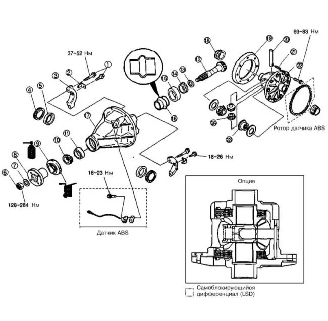 В том месте где карданный вал присоединяется к заднему дифференциалу, проверьте не задевает ли соединительный фланец об корпус дифференциала (позиция 8 может задевать о позицию 17)
