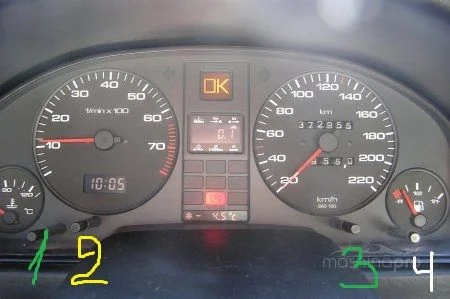 4 — кнопка подстройки стрелки топлива (Для регулирования индикатора количества бензина снять маленькими щипцами черную пробку. Теперь можно отрегулировать индикатор вращением установочного винта при помощи торцового шестигранного гаечного ключа).