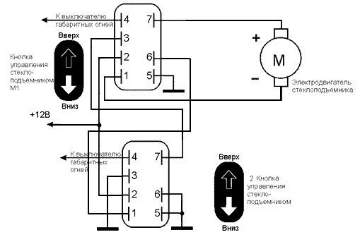 Изначально в кнопке стеклоподъемника между минусовыми контактами “2”, “6” и “7” сделаны перемычки. Для того чтобы подключить дублирующую кнопку стеклоподъемника ВАЗ 2110, эти контакты необходимо разъединить. После этого подключение стеклоподъемников выполняется в следующей последовательности: