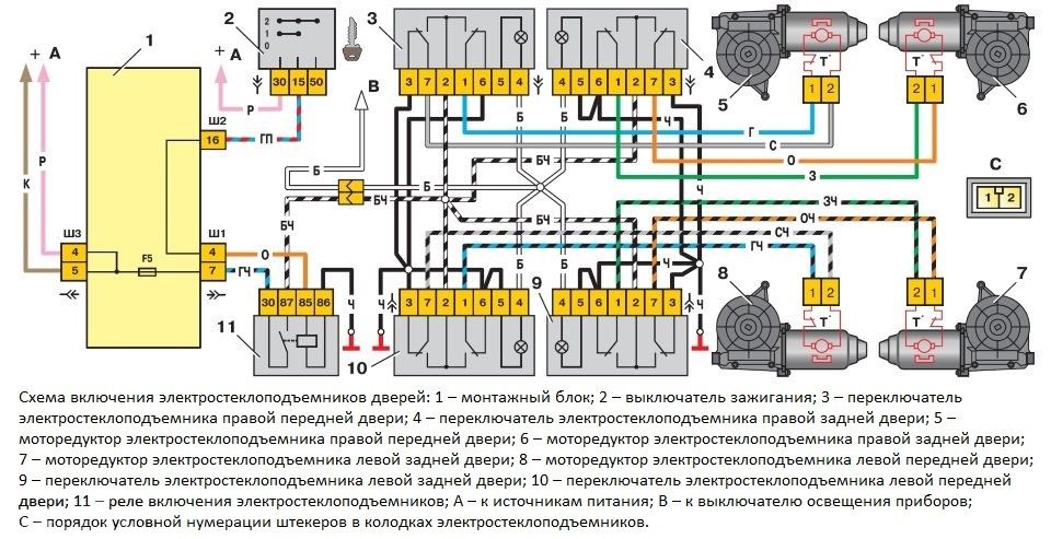 Здравствуйте. Хочу установить стеклоподъемники на ВАЗ 2110. Подготовки под стеклоподъемники нет, буду подключать все с нуля. Дайте, пожалуйста, схему заводского подключения в хорошем качестве.