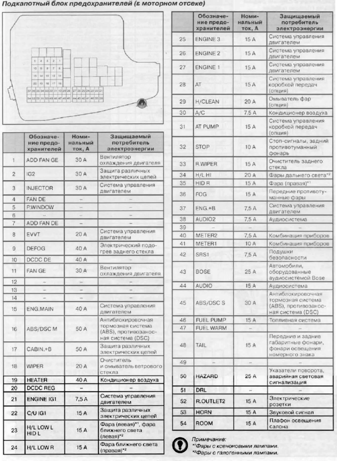 Под капотом находятся предохранители вентилятора охлаждения двигателя, подогрева заднего стекла, омывателя, антиблокировочной системы тормозов, кондиционера системы управления двигателя. Кроме них также установлены предохранители фар ближнего света, дальнего света, ПТФ, омывателя фар и многие другие. Замена предохранителей описана здесь.