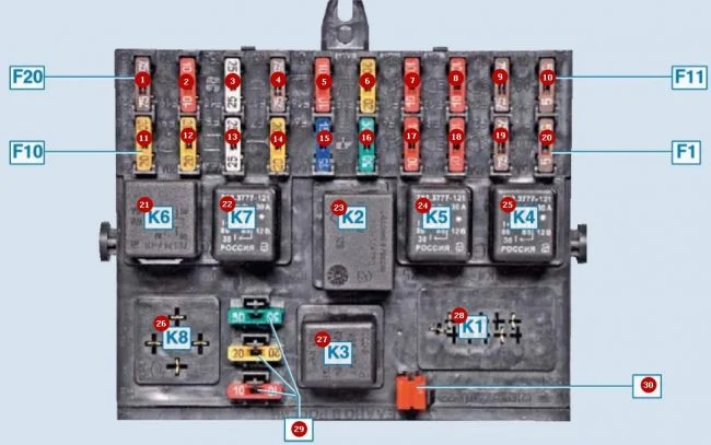 Светло-коричневые предохранители (F1,F11) — 5А; коричневые — 7,5А; красные — 10А; зеленый — 30А; синий — 15А; желтые — 20А; белые — 25А.