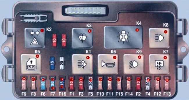 Блок реле и предохранителей находится под капотом с левой стороны. Коричневые — 7,5 А. Красные — 10 А. Синие — 15 А. Серые — 20 А. Голубые — 30 А.