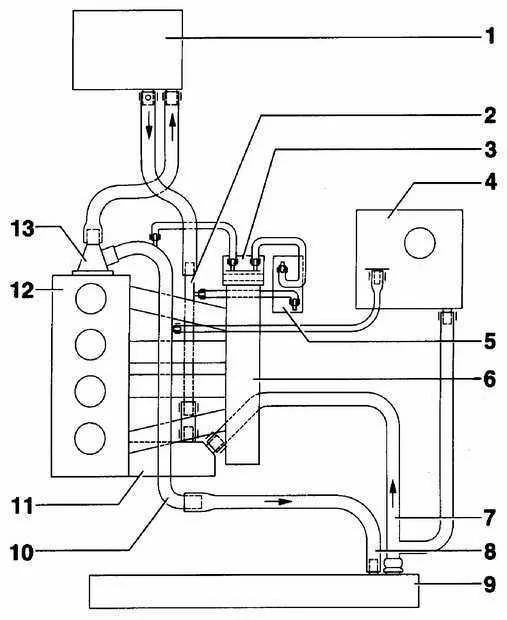 Этот патрубок находится на головке блока, в задний части двигателя, соединяет между собой радиатор отопителя и радиатор двигателя № 13.