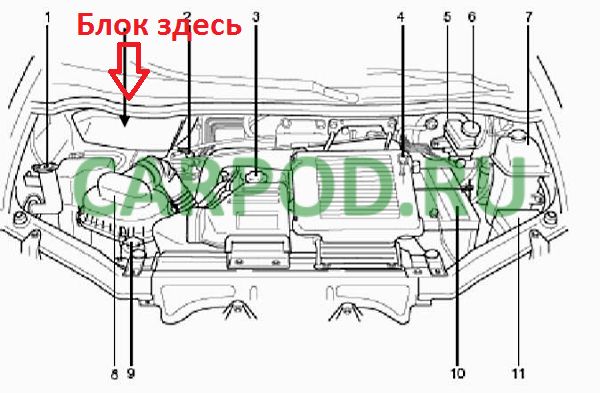 На схеме указано место расположения подкапотного блока предохранителей, также прикрепляю место расположения реле (блоки отличаются дорестайл от рестайла).