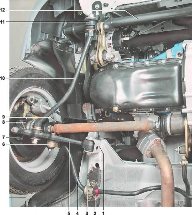 Проверьте растяжку (№10) рычага и ее крепления, резинки, так же проверьте сам рычаг (№5) и его сайлетблоки.