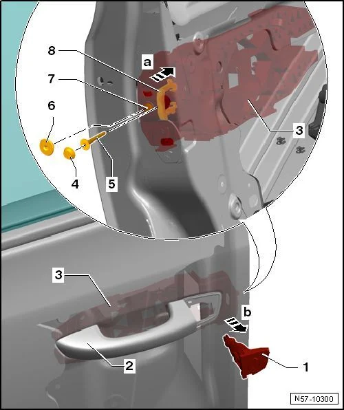 - Извлечь корпус личинки замка 1 (в правом углу стрелка b) относительно двери из опорной скобы ручки 3.