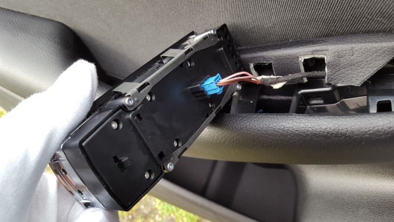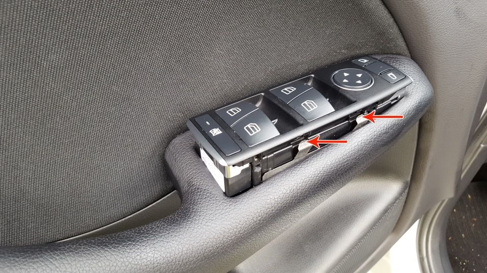 - Плоской отверткой или лопаткой подденьте в указанных местах блок управления стеклоподъемниками и выньте его вверх, отсоедините разъем.