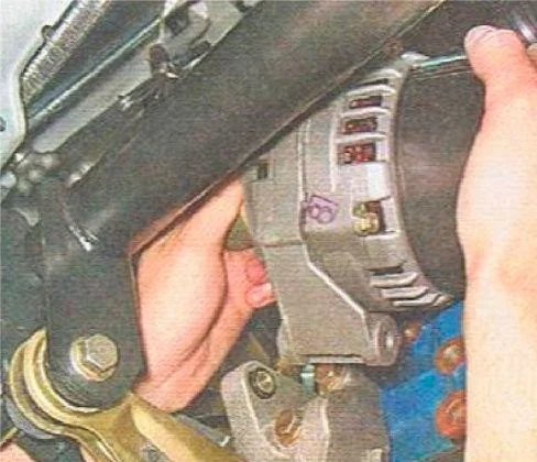 - Открути гайку нижнего крепления генератора к кронштейну.