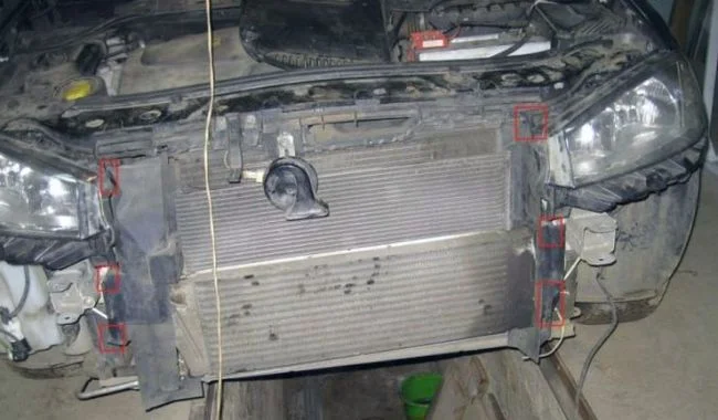 Как бампер снят, снимай усилитель за бампером (открутить два болта ключом на «16»).