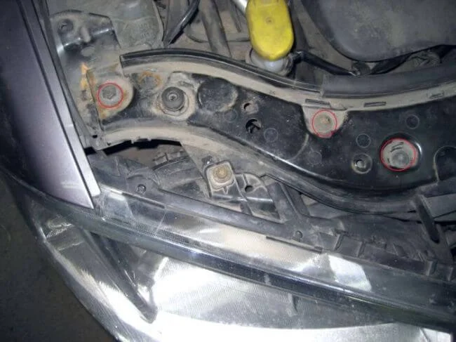 Затем переходи к снятию блок-фар (болты крепления под торгс). С каждой стороны фара крепится в трех местах. При снятии фары не забывайте отсоединить разъем.
