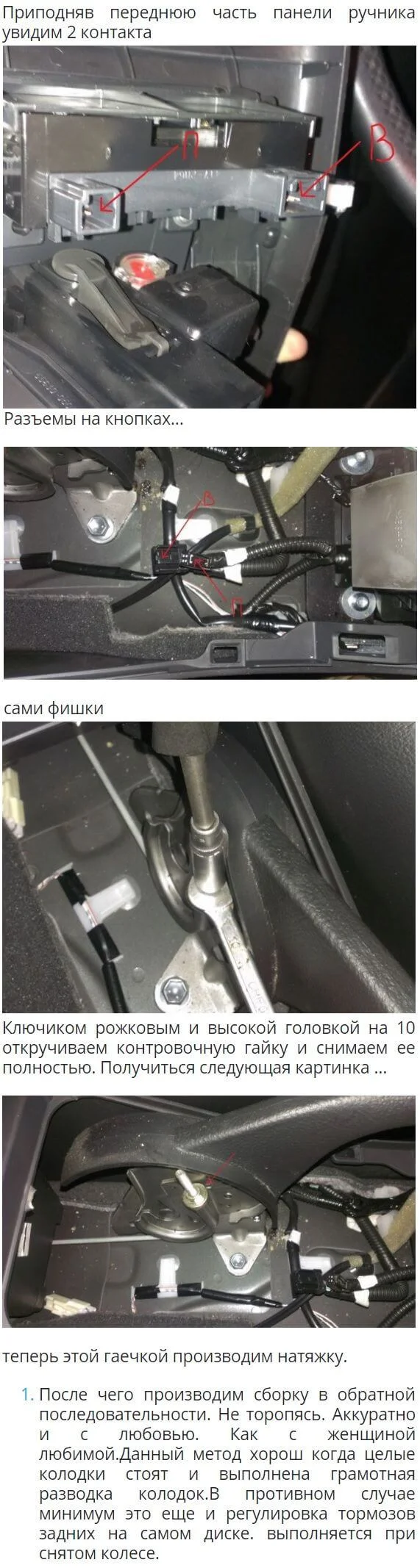 Вот вам два варианта «Авенсиса» про регулировку стояночного тормоза, выбирайте который ваш