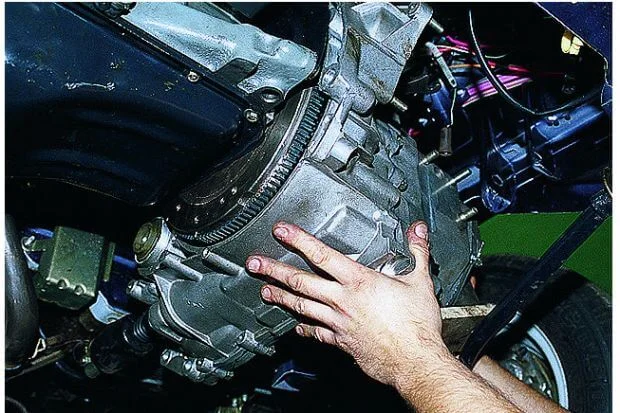 Отвести коробку от двигателя и снять (желательно, вдвоем).