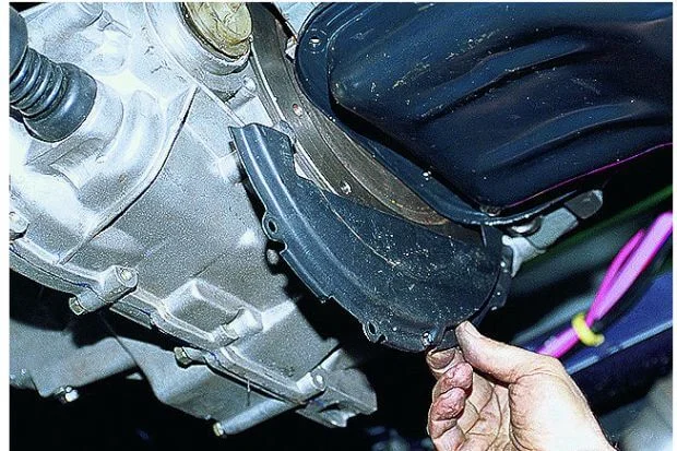 Сначала сливается масло из коробки. Затем снимается брызговик движка, отсоединяется тяга привода и трос сцепления.