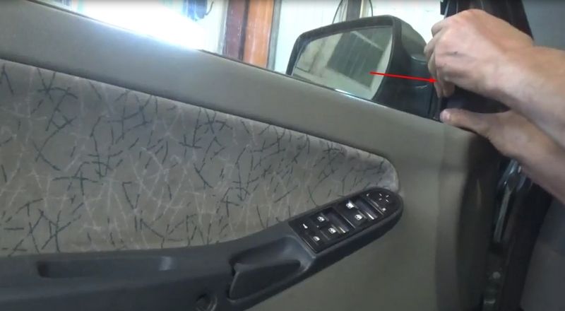 2. Заведите пальцы под пластиковую накладку закрывающую крепеж зеркала и потянув на себя снимите ее. Накладка закреплена на защелках.