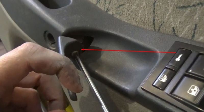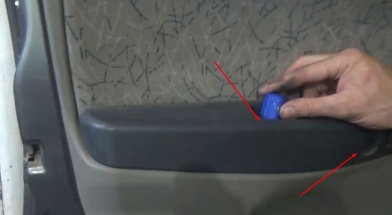 6. В углублениях снизу выкрутите два винта крепежа обшивки двери, а также открутите пластиковую кнопку открывания/закрывания двери. Винты также под крестовую отвертку