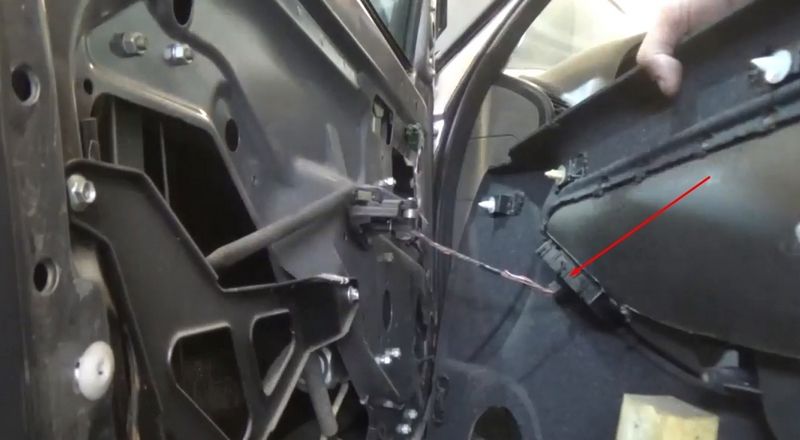 8. Поднимите обшивку вверх и выведите из уплотнительной резинки. Далее сжав фиксатор, отключите разъем питания на кнопки стеклоподъемников и уберите обшивку в сторону.
