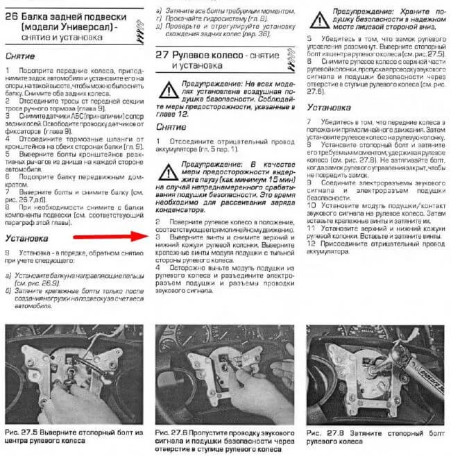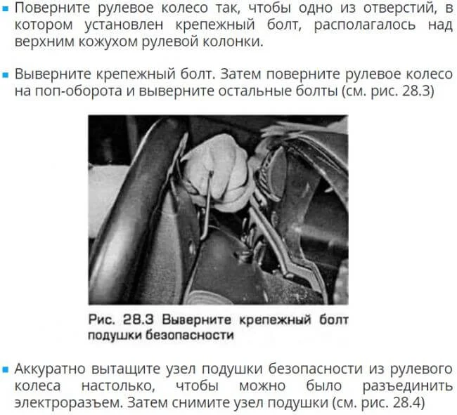 Добавлю малость другую инструкцию, в которой при снятии подушки безопасности на руле, снимать кожух колонки вроде и не надо. После того как отсоединили аккумулятор и выдержали 15 минут, далее так: