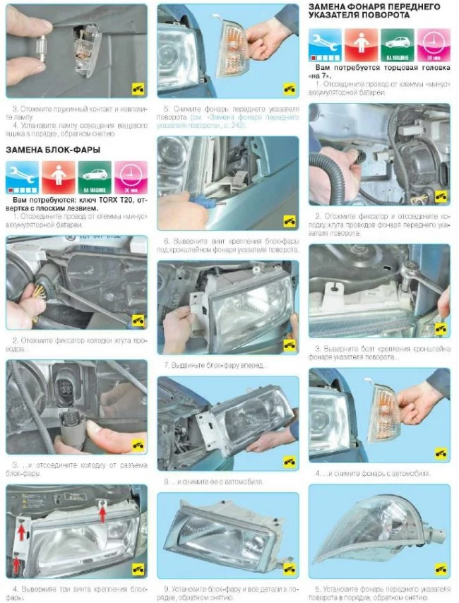 Нужно сначала снять фару, как это сделать описано ниже.