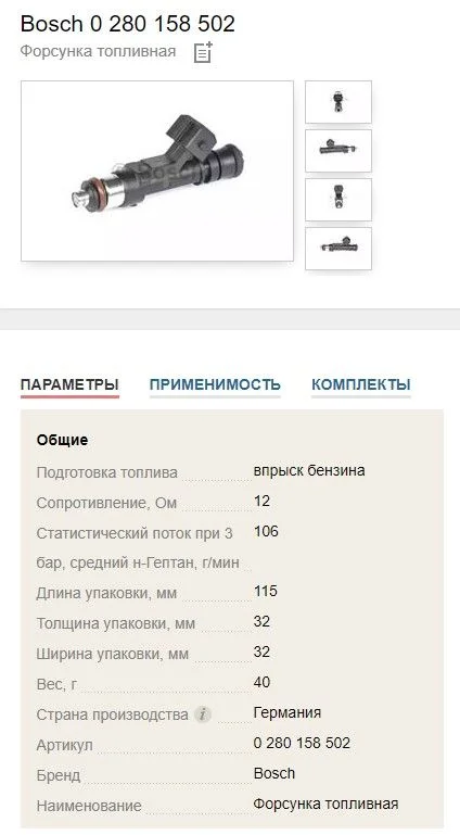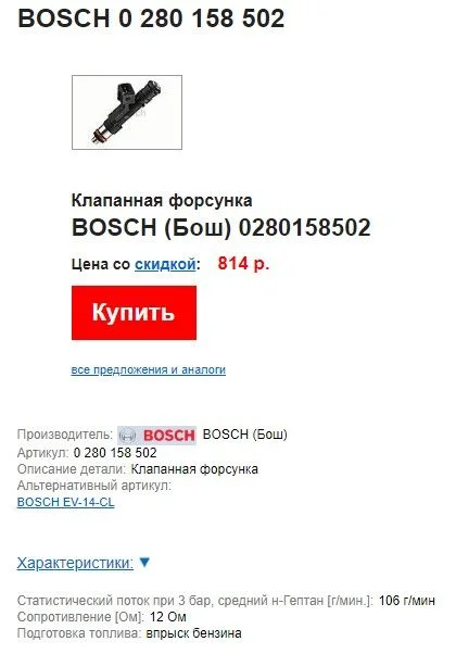 Ваша BOSCH 0 280 158 502 относится к высокоомным. У неё сопротивление может быть от 11-ти до 16-ти Ом (хотя есть источники которые пишут что до 17-ти Ом). Если показатели выше или ниже, значит форсунка неисправна и её надо менять.