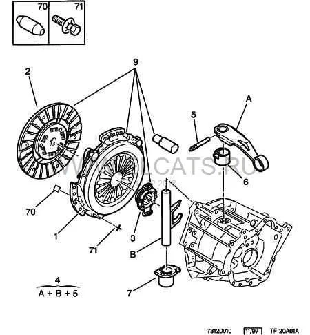 Вот вам версия ослабления троса: винт под номером 5 ослабел, рычаг «А» провернулся при нажатии на педаль сцепления, трос провис.