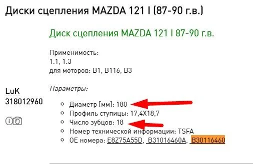 Mazda B301-16-460 Диск сцепления, есть аналоги, например Luk 318 0129 60 Диск сцепления (18 зубцов, диаметр 180 мм).