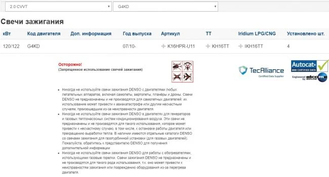 Подойдет ли свеча зажигания denso K16HPR-U11 к автомобилю Kia Sportage III (модификация 2.0, G4KD, 150 л.с. бензиновый)?