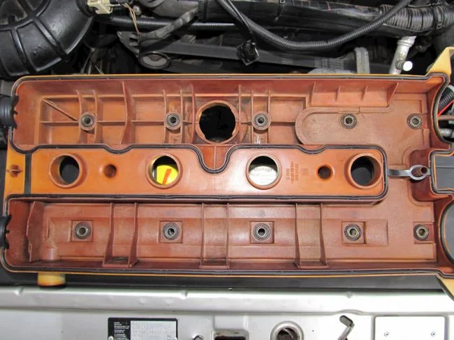 Вот вокруг свечных отверстий прокладка проложена, она от времени стареет, дубеет, просаживается и перестаёт удерживать масло