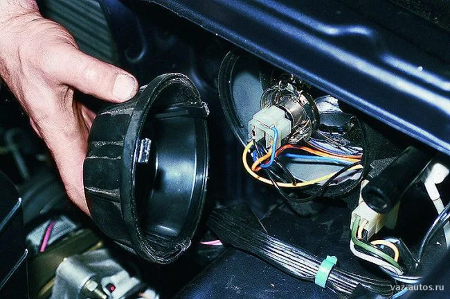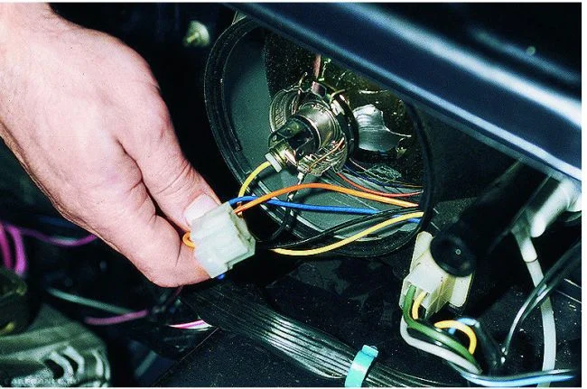 Зима, ночь — конечно вам некогда искать оборванный или замкнувший провод. Просто отключите от лампы соединительную колодку проводов, цепляйте на фару дополнительный провод, на контакт ближнего света (чтобы не слепить встречные машины), второй конец соедините на аккумуляторе — вот вам и освещение чтобы доехать до дома. Не забудьте и минусовой провод организовать, его не обязательно тянуть к аккумулятору (прицепить короткий проводок к лампе и на корпус к любому болтику на кузове поблизости от фары)