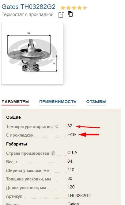 Оригинал Mazda HE41-99-152C, аналогов много, например Gates TH03282G2, температура открытия — 82 градуса.