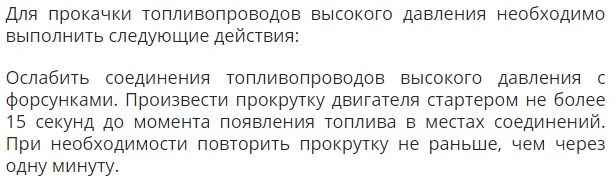После появления топлива затянуть гайки топливопроводов с усилием 21.6-24.5 Нм (2.2-2.5 кгсм).