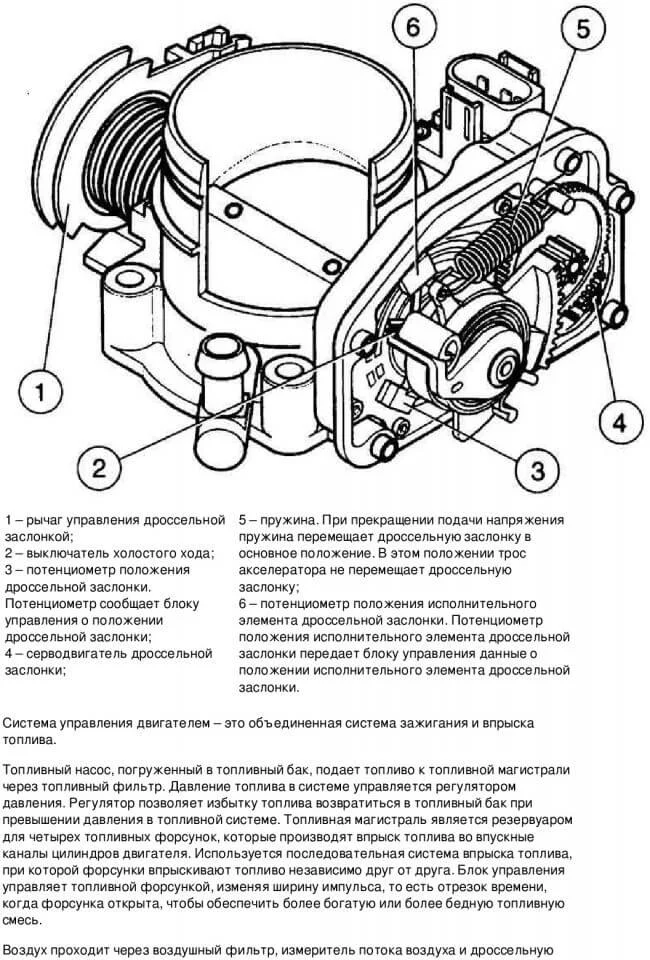 Вот у вас стоит такой или примерно такой дроссельный узел… И вот на нём скорее всего неисправен потенциометр. На верхнем рисунке датчик ДМРВ — на него пока не обращайте внимания.