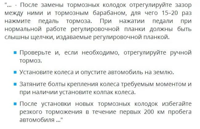 Вот выдержка из мануала по замене задних тормозных колодок барабанного типа. Если это ваши тормоза(я имею ввиду барабаны), то может вы что-то ещё не доделали?