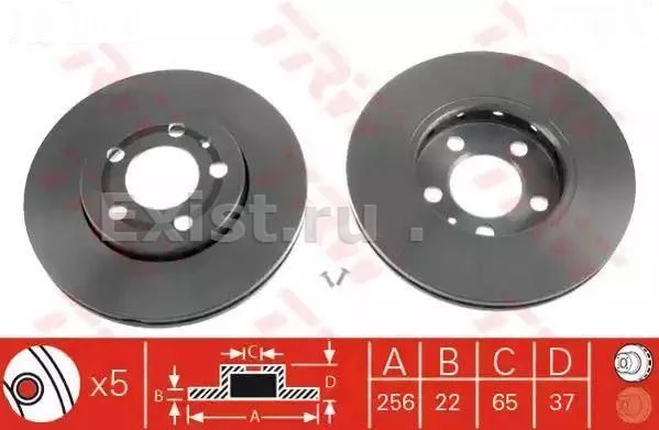 Толщина нового тормозного диска 22мм. При износе, минимальная толщина 19мм. Диаметр центрирования 65мм, Сверловка 5/100.